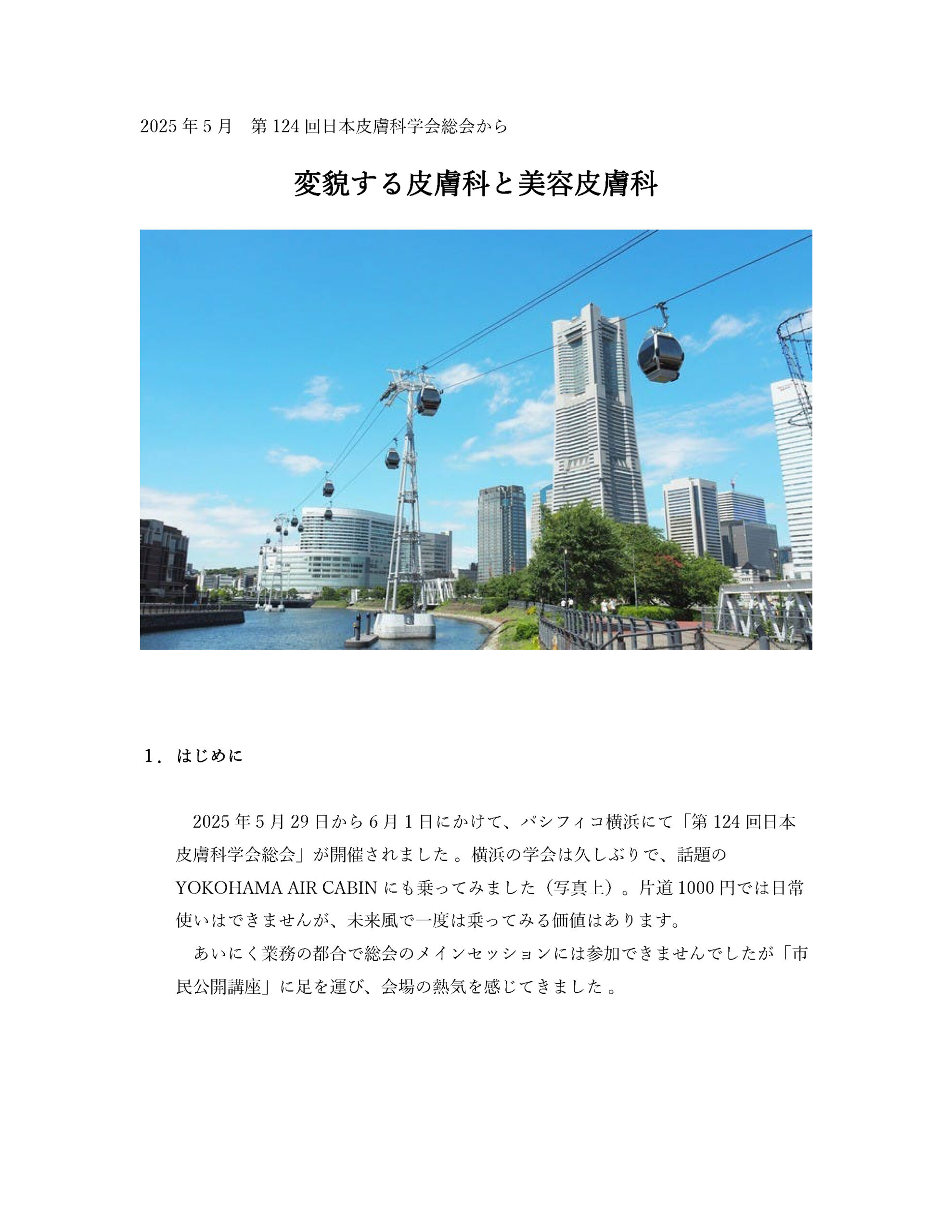 2025年5月29日から6月1日にかけて、パシフィコ横浜にて「第124回日本皮膚科学会総会」が開催されました 。横浜の学会は久しぶりで、話題のYOKOHAMA AIR CABINにも乗ってみました(写真上)。片道1000円では日常使いはできませんが、未来風で一度は乗ってみる価値はあります。